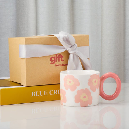 Floral-Patterned Ceramic Coffee Mug with Pink Handle