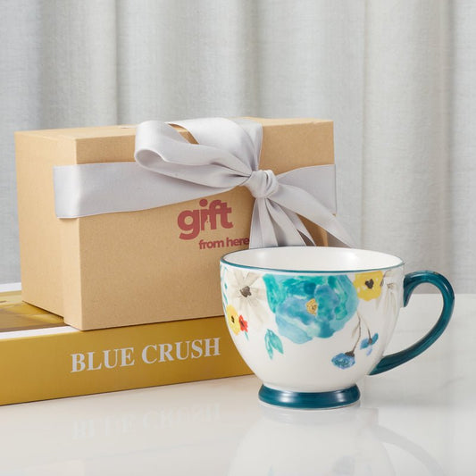 Floral-Patterned Ceramic Mug with Blue Handle