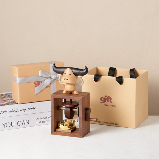 Handcrafted Cute Bull Figurine Hand Crank Wooden Music Box